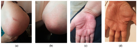 In June 2023, the patient presented to our department with a squamous rash on her hands, elbows, and scalp, as shown in Figure 1a,b.