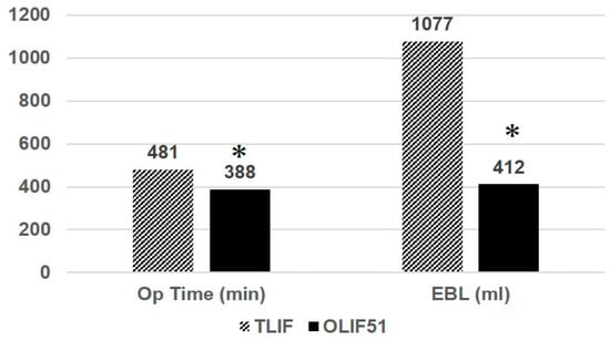 Operation time and estimated blood loss (EBL) for the two groups. The asterisk depicts statistical significance at the p < 0.05 level between two groups.