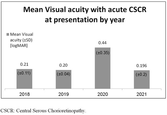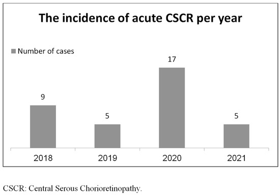 The retrospective data chart of all study participants is presented in the Supplementary Materials, Table S1. During the COVID-19 pandemic era, there were 17 new cases of CSCR (0.005% per population). In comparison, there were 18 new cases of CSCR over the comparative three-year period (0.002% per population) (Figure 1).