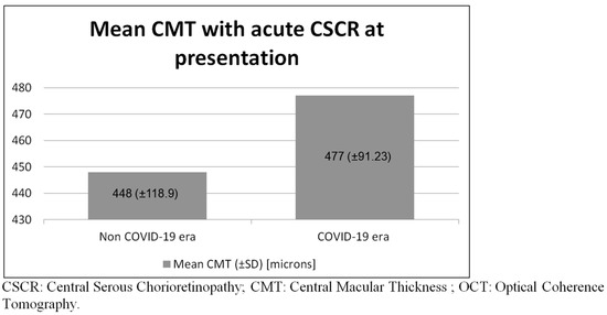 For the COVID-19 epidemic outbreak group compared with the non-COVID-19 group, the initial presentation and hospital administration times were delayed by 33.5 and 22.1 days, respectively (p = 0.84). As shown in Figure 3, the initial CMT at presentation for the COVID-19 outbreak group compared with the non-COVID-19 group was 477.7 and 501.6 microns, respectively (p = 0.68).