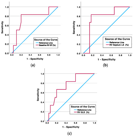 Receiver operating characteristic (ROC) curves of (a) baseline RV EF ≤ 32.5%, (b) RV septum LS Δ ≥ 2.95%, and (c) RV GLS Δ ≥ 3.60%. RV—right ventricle; GLS—global longitudinal strain, LS—longitudinal strain, EF—ejection fraction.