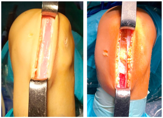 - Schandl, K.; Horváthy, D.B.; Doros, A.; Majzik, E.; Schwarz, C.M.; Csönge, L.; Abkarovits, G.; Bucsi, L.; Lacza, Z. Bone-Albumin filling decreases donor site morbidity and enhances bone formation after anterior cruciate ligament reconstruction with bone-patellar tendon-bone autografts. Int. Orthop. (SICOT) 2016, 40, 2097–2104. [Google Scholar] [CrossRef]