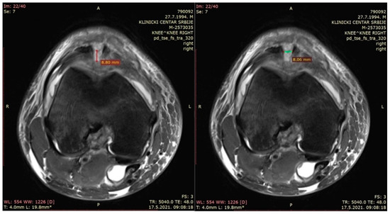 - The width of the patellar bone defect (mm)—a variable used to assess the width of the bone defect from the first section caudal to the top of the defect in a transverse plane in the pd_tse_fs_tra sequence (Figure 3—right).