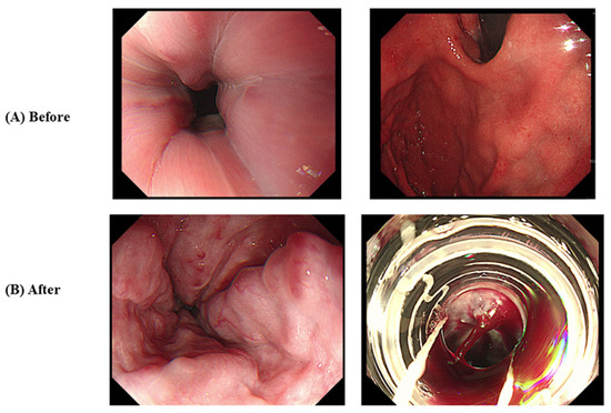 Endoscopic findings of Case 1. (A) Before atezolizumab/bevacizumab and (B) after atezolizumab/bevacizumab.