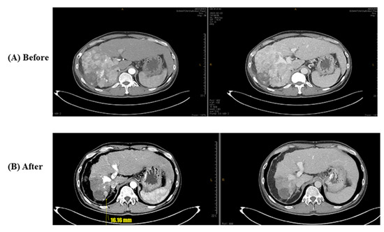 Radiologic findings of Case 1. (A) Before atezolizumab/bevacizumab and (B) after atezolizumab/bevacizumab.