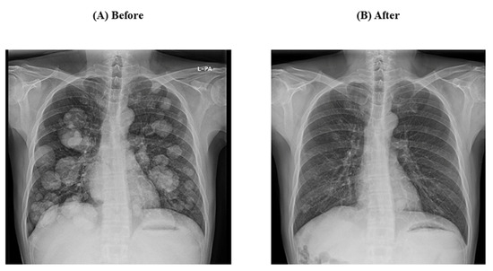 Improvement of lung metastasis of Case 1. (A) Before atezolizumab/bevacizumab and (B) after atezolizumab/bevacizumab.