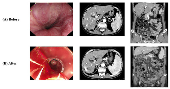 Endoscopic and radiologic findings of Case 2. (A) Before atezolizumab/bevacizumab and (B) after atezolizumab/bevacizumab.