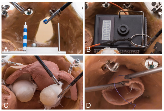 Laparoscopic exercises. (A). Moving Pearls. (B). Hot Wire. (C). Vaginal Vault Closure. (D). Ovarian Cyst Enucleation. From Ackermann et al., 2023 [6].
