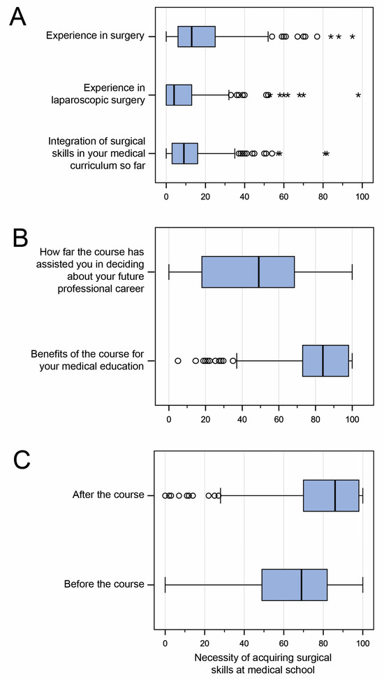 Evaluation of the training program by the students. (A). Previous practical experience in surgery, previous experience in laparoscopic surgery, and previous integration of surgical skills training into medical studies. (B). Value of the course in influencing future career choices and its benefits for medical education. (C). Assessment of the need to acquire surgical skills at medical school: before and after the course.