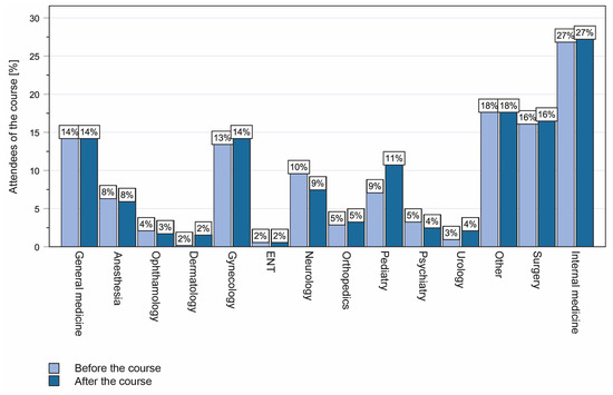 In order to determine the impact of the course on subsequent professional choices, we conducted a survey before and after the course in regard to career aspirations (Figure 5). The survey did not reveal any significant changes. The observation was confirmed when the students were asked whether the laparoscopy course had helped them in making decisions about their future career. The median benefit reported here was 46.4% (IQR 18–61%) on the VAS (Figure 3B). In contrast, medical students rated the course very highly in terms of its usefulness for their medical education (median VAS 80.7%, IQR 73–98%, Figure 3B). Interestingly, students rated the need for acquiring surgical skills at medical school significantly lower (median) at the beginning of the laparoscopy course than they did after completing the course (median VAS 64.3%, IQR 49–82% vs. 79.4% IQR 70–98%; p < 0.001; Figure 3C).