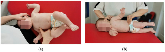 Figure 2. (a) Vojta therapy, reflex rolling, phase 1. (b) Vojta therapy, reflex rolling, phase 2.