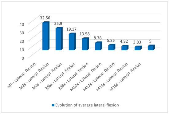 In Table 7, the evolution of lateral flexion can be observed during the nine measurements. A permanent decrease in degrees of lateral flexion is observed from an average of 32.56 at the initial measurement to an average of 3.83 at week 16. This can also be seen in Figure 4.