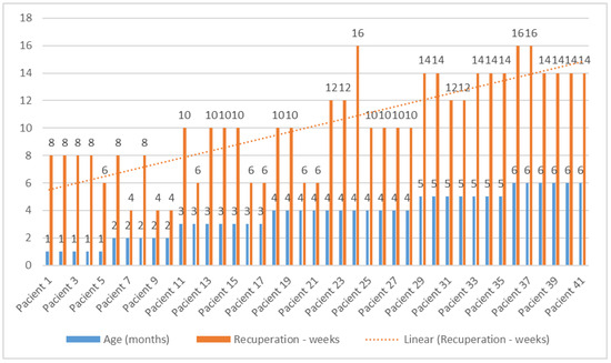 In Table 11, the results of the post hoc Bonferroni test are presented, which show the extent to which the averages of the groups taken two by two differ. Significant differences in recovery time were observed in young patients (1, 2, 3, and 4 months), where it had lower values compared to patients aged 5 and 6 months, for whom recovery times had higher average values.