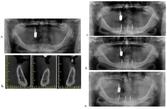Preoperative CBCT scans and digital panoramic radiographs were obtained to determine mini-implant dimensions. Panoramic radiographs were obtained again after the MDI insertions to check their parallelism and positions. In some participants, panoramic radiographs were also obtained at the follow-up examinations (Figure 2a–e).