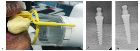 At the MDI loading (mounting of metal housings with O-rings), digital retroalveolar radiographs were obtained to determine the marginal bone level (Minray Soredex Intraoral, Tuusula, Finland, 70 kV, 0.16 mAs; the long-cone paralleling technique). The digital retroalveolar radiographs were also obtained at the 1-, 3-, and 5-year clinical follow-up examinations. A film holder (X-ray holder, Super-Bite®, Kerr USA, Orange, CA, USA) with a customized silicone index for each patient was used for reproducibility (Figure 3a–c).