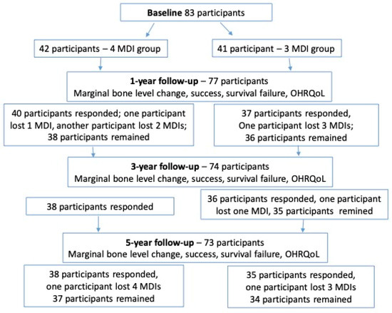 The sample size calculation was made based on the primary outcome, i.e., peri-implant MBL change. Assuming that the mean MBL change may differ up to one mm between the groups with a standard deviation of one mm in each group and accounting for even 30% of possible dropouts during the observation period (five years), the calculation showed that 26 participants should be included in each group, with the type I probability error alpha set at p < 0.05 and the power at 80%. However, at the baseline of the study, a total of 83 participants were included: 42 in the 4-MDI group and 41 in the 3-MDI group.