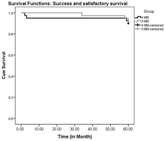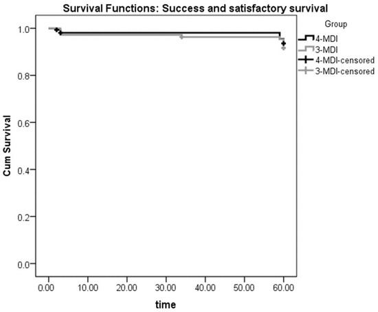 Kaplan–Meier curves were utilized for the survival analysis (MDI failures and compromised survivals were counted as one category, while successful implants and satisfactory survivals were counted together as another category). A comparison of the 4-MDI and 3-MDI groups was made using the Log-rank Mantel–Cox test.