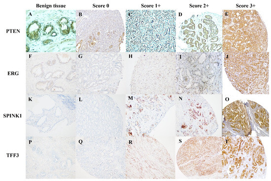 IHC for PTEN, ERG, SPINK1, and TFF3. Intact PTEN in benign tissue (A). PTEN loss in PCa, Score 0 (B) and Score 1 (C). Intact PTEN in PCa, Score 2+ (D), and Score 3+ (E). Negative ERG in benign tissue (F). Negative ERG in PCa, Score 0 (G), and Score 1+ (H). Positive ERG in PCa, Score 2+ (I), and Score 3+ (J). Negative SPINK1 in benign tissue (K). Negative SPINK1 in PCa, Score 0 (L), and Score 1+ (M). Positive SPINK1 in Pca, Score 2+ (N), and Score 3+ (O). Negative TFF3 in benign tissue (P). Negative TFF3 in Pca, Score 0 (Q), and Score 1+ (R). Positive TFF3 in PCa, Score 2+ (S), and Score 3+ (T).