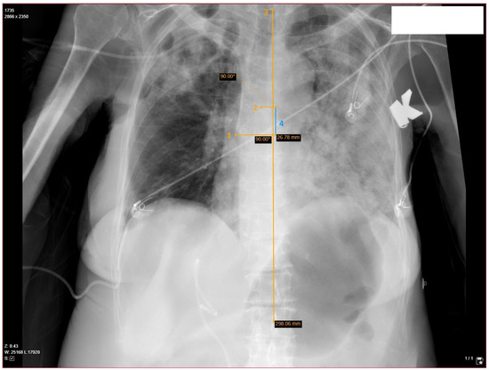 Catheter’s tip confirmation and optimal insertion length measurement demonstrated with yellow markings. Chest X-ray in the supine position obtained after surgery: after determining the patient’s axis using 1st and 12th thoracic vertebrae as landmarks (3), the distance between the carina and catheter’s tip are measured on the axis (4), which is subtracted or added to 20 cm (default insertion length in this study). 1—catheter’s tip, 2—carina, 3—patient’s axial axis, 4—catheter’s tip shift from the ideal depth.