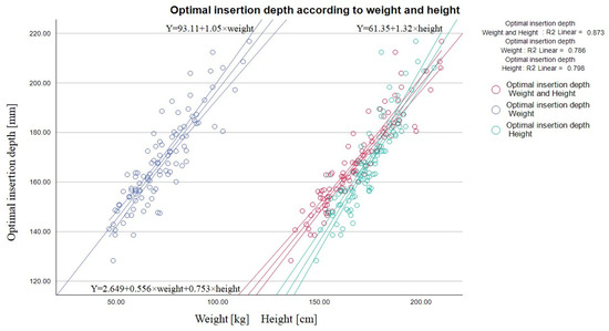 Multivariable linear regression model analysis showed the ideal catheter’s length moderate dependency on the vein’s depth, diameter, puncture angle, and path length (R—0.580) (Table 2). Prediction equation: optimal insertion length [mm] = 209.822 + 1.646 × (vein diameter [mm]) + 5.571 × (vein depth [mm]) − 2.056 × (puncture path [mm]) − 2.925 × (puncture angle [degrees]). Since these factors are influenced the by patient’s anthropometric qualities, such general parameters as weight and height show a better prognostic value in coefficients of determination (R2) of weight—0.786—and height—0.796 (Figure 3).