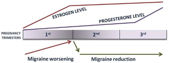 Pregnancy, marked by dramatic hormonal changes, poses a unique challenge for women with pre-existing migraines, necessitating a careful balance between managing their condition and ensuring the well-being of the developing fetus. Estrogen, progesterone, and other hormonal changes; disrupted sleep; stress; nausea; and dehydration during pregnancy can influence the frequency and severity of migraines. While some women experience migraine symptom relief during pregnancy, others may experience an exacerbation of their symptoms, particularly in the first trimester of pregnancy. MWAs have a general tendency to improve compared with MAs, which are also more likely to occur during de novo pregnancy [36]. The first trimester of pregnancy is the time when estrogen levels rise; therefore, during this stage of pregnancy, it is possible for some women to experience transient symptom worsening. The second and the third trimesters are usually known for their tendency for symptom relief, and a nearly 90% symptom reduction is expected during this time of pregnancy [37]. During this stage of pregnancy, hormone levels are stable, estrogen and endogenous opioid levels are elevated, and, most importantly, there are no more hormone fluctuations, which eliminates one of the major attack triggers (Figure 1) [36].