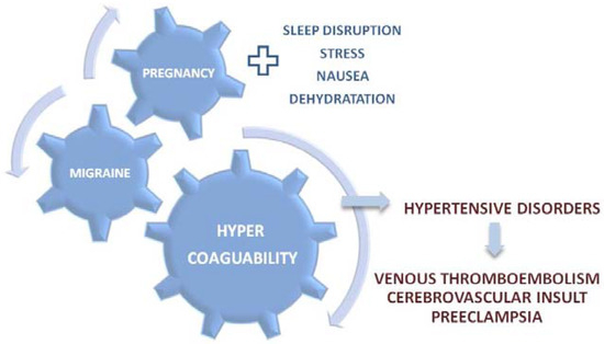 Pregnancy and migraine have another common characteristic, hypercoagulability (Figure 2). During pregnancy, hypercoagulability is a significant risk factor for some of the most serious cardiovascular incidents, including venous thromboembolism and cerebrovascular insult [36]. Furthermore, interference between hypercoagulability, cardiovascular disorders, and pre-eclampsia present another significant risk factor for the maternal, fetal, and neonatal morbidity and mortality [40]. Among patients with persistent migraine symptoms during pregnancy, symptom deterioration is associated with a 13-fold higher risk of a hypertensive disorder in pregnancy compared with the patients who experience migraine symptom improvement, or whose symptoms are remitted [41].