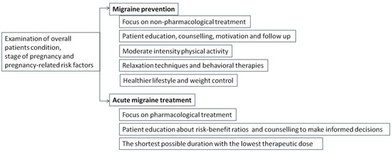 Prevention, early diagnosis, regular follow ups, and non-pharmacological treatment options are the cornerstones of migraine treatment whenever possible (Figure 5) [98]. Acute migraine often requires pharmacological treatment in order to reduce the attack frequency and duration and to provide the optimal treatment. Whenever a new drug is prescribed to a pregnant woman, treatment should be tailored to the shortest possible duration with the lowest therapeutic dose, and a risk–benefit ratio should be presented and clarified [99].