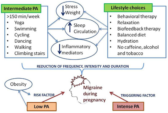 PA requires patients’ committed involvement, and it is often time consuming. Other lifestyle interventions and changes in daily habits, including a balanced daily calorie intake, hydration with non-caffeinated fluids, stress reduction, and complete alcohol and tobacco avoidance, may be an effective alternative for migraine frequency reduction as well (Figure 4) [66]. Most of these recommendations and interventions are the actual requirements of pregnancy, and their incorporation into pregnant migraineurs’ daily life could at least partially explain the tendency of frequency and severity of migraines to decrease during pregnancy [67].