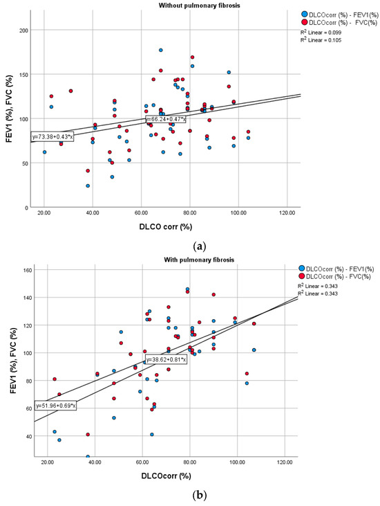 Correlation between DLCO corr (%), FEV1 (%), and FVC (%) in patients post-COVID-19, without pulmonary fibrosis (a) and with pulmonary fibrosis (b). (DLCO: diffusing capacity of lung for carbon monoxide; FEV1: forced expiratory volume in 1 s; FVC: forced vital capacity).