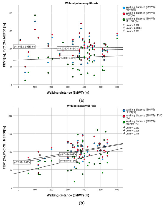 Correlation between the walking distance (m), FEV1 (%), and FVC (%) in patients post-COVID-19, without pulmonary fibrosis (a) and with pulmonary fibrosis (b). (6MWT: 6-minute walking test; FEV1: forced expiratory volume in 1 s; FVC: forced vital capacity).