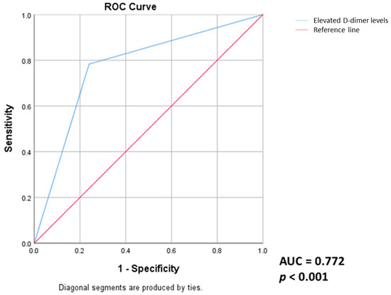 Based on literature data reporting an association between elevated D-dimer values and reduced DLCO values and our findings of a strong significant correlation between D-dimers and DLCO corrected for hemoglobin, we tested further the link between the persistence of elevated D-dimer values and reduced DLCO values (less than 80% of predicted values) two years after COVID-19. Receiver operating characteristic (ROC) analysis was performed to calculate the area under the curve for the persistence of elevated D-dimer values in order to determine if this parameter could act as a predictor associated with the long-term persistence of decreased values of DLCO in patients post-COVID-19 (area under the curve of 0.772 and p < 0.001) (Figure 4).