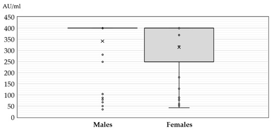 There was no significant difference in the antibody levels between seropositive males and females (median titer 400 AU/mL, IQR = 400–400 vs. 400 AU/mL, IQR = 248–400, p = 0.274) (Figure 1).