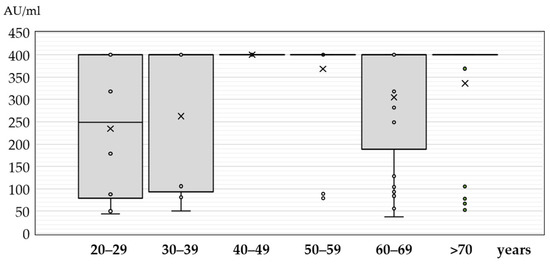 The antibody titers differed significantly between age groups (p = 0.008). In the age group less than 20 years, only two seropositive samples showed an antibody titer of 179 AU/mL and 400 AU/mL. The median titers in patients older than 20 years ranged from 248 AU/mL (IQR = 69–400) to 400 AU/mL (IQR = 400–400) (Figure 2).
