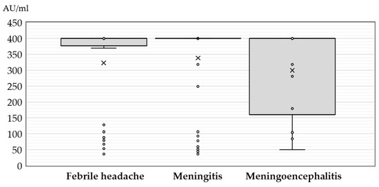 No significant difference (p = 0.308) in JCPyV antibody titer was found in patients presenting with febrile headache (median 400 AU/mL, IQR = 369–400), meningitis (median 400 AU/mL, IQR = 400–400), and meningoencephalitis (median 400 AU/mL, IQR = 152–400) (Figure 3).