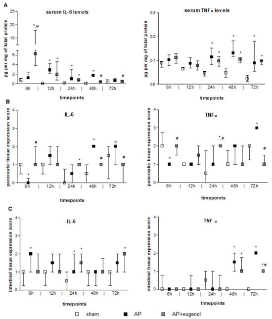 The effect of duct ligation-induced AP in eugenol-treated and untreated rats. (A) Serum IL-6 and TNFα levels, (B) IL-6 and TNFα pancreatic tissue expression, and (C) IL-6 and TNFα intestinal tissue expression. All data are presented as median and interquartile range. Where *, p < 0.05 vs. the sham group and where #, p < 0.05 vs. the AP group, at the corresponding timepoints.