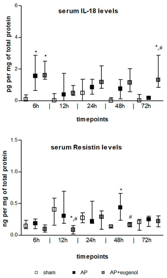 Serum IL-18 and resistin levels in duct ligation-induced pancreatitis in rats with or without eugenol treatment. All data are presented as median and interquartile range. Where * p < 0.05 vs. sham group and where # p < 0.05 vs. AP group, at the corresponding timepoints.