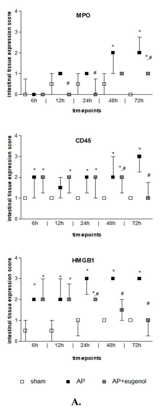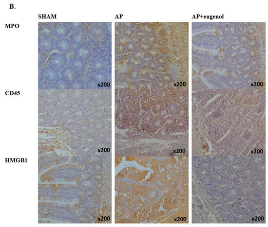 (A) MPO, CD45, and HMGB1 intestinal tissue expression. All data are presented as median and interquartile range. Where * p < 0.05 vs. the sham group, and where # p < 0.05 vs. the AP group, at the corresponding timepoints. (B) Immunohistochemical detection of MPO, CD45, and HMGB1 intestinal expression at 72 h in a rat model of biliopancreatic duct ligation-induced pancreatitis with or without eugenol treatment.