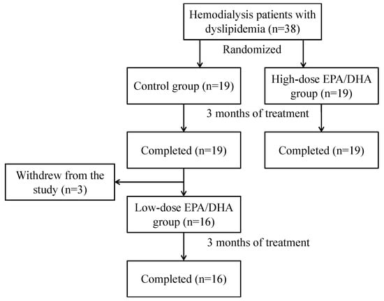 Consecutive patients who were admitted to Yokosuka City Hospital between July and November 2015 were recruited. The study was approved by the ethics committee of Yokosuka City Hospital and registered at the University Hospital Medical Information Network (UMIN000017853). All participants provided written informed consent prior to the study enrollment. The inclusion criteria were as follows: patients (1) who underwent hemodialysis with a diagnosis of dyslipidemia, (2) who were aged ≥ 20 years, (3) who did not receive omega-3 fatty acids (including supplements) in the last 6 months, and (4) who provided voluntary informed consent after receiving a full explanation of the study’s purpose and methods. In contrast, the exclusion criteria were as follows: patients (1) with a history of allergy to omega-3 fatty acids, (2) with confirmed or suspected pregnancy, (3) with active bleeding, and (4) who were removed from the study for any reason at the investigators’ discretion.