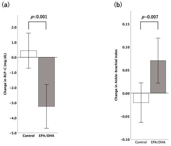All analyses were performed using the IBM SPSS software version 22.0 (IBM Corp., Armonk, NY, USA). The differences between the EPA/DHA and control groups were evaluated using the Student’s t-test, Mann–Whitney U test, or chi-squared test. A sample size calculation was performed using power analysis. Pearson’s correlation analysis and multiple linear regression analysis were used to evaluate the relationships between the changes in the RLP-C level and the ABI. All data are expressed as the mean ± standard deviation or a number (percentage). A p-value of <0.05 (two-sided) was considered significant.