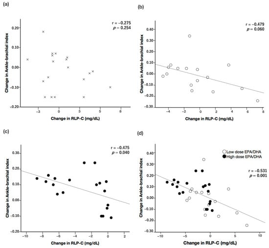 Correlation between the changes in RLP-C levels and ABI values in the (a) control group, in “x” (b) low-dose EPA/DHA group, in white circles (c) high-dose EPA/DHA group, in black circles and (d) low- and high-dose EPA/DHA groups combined in white and black circles, respectively. ABI: ankle–brachial index; DHA: docosahexaenoic acid; EPA: eicosapentaenoic acid; n.s.: not significant; RLP-C: remnant-like lipoprotein cholesterol.