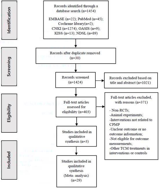 The procedure for the literature search and screening is presented in Figure 1. Only pyrite-related studies, such as TCM or traditional herbal medicines, were selected for review from the relevant literature. A total of 1454 articles were identified, including 22 from EMBASE, 45 from PubMed, 2 from Cochrane, 1274 from CNKI, 9 from OASIS, 13 from KISS, and 89 from NDSL. Among them, 30 duplicate studies were excluded. After screening the titles and abstracts, 1021 studies that were not related to fractures or CPMP were excluded. The full texts of the 403 remaining articles were assessed for eligibility. In total, 371 articles were excluded for the following reasons: non-RCTs (such as case reports or review articles), animal experiments, unclear outcomes, no outcome information, ineligibility for outcome measurements, and other Chinese treatments in the intervention or control groups. Among the 32 selected studies, three studies were excluded because they did not present the results of the total effective rate, VAS, pain reduction, blood test, and other related results. Finally, 29 studies were included in this systematic review.