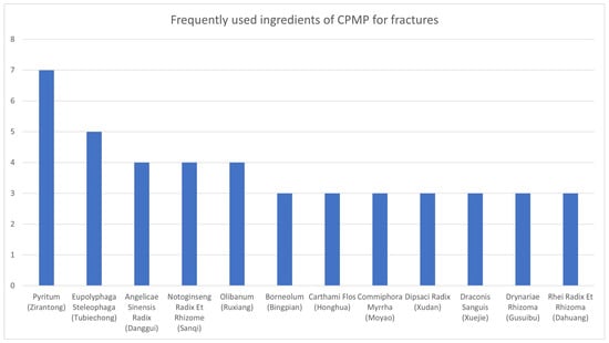 In this study, CPMP was mostly used after reduction or fixation, such as open reduction and internal fixation or manual reduction and splinting. Although surgical treatment can effectively restore the anatomical position of the fracture and provide strong fixation, it has no obvious effect on the recovery of fracture healing. A previous study reported that postoperative side effects or complications may occur from delayed healing due to hematoma after the fracture []. To prevent complications during fracture healing, traditional medicine suggests that activating blood circulation and removing stagnation can promote the absorption and dissipation of blood, thereby removing harmful elements and creating favorable conditions for fracture healing []. The seven CPMPs included in this study are considered ideal selections of compounds because they have shown common efficacy in promoting blood circulation, dispelling blood stasis, reducing swelling, and relieving pain. Most of the individual components included in the seven CPMPs were blood-activating and stasis-dispelling medicinals. Excluding pyrite, the most used Tubiechong in CPMPs is an insect medicine that has the action of releasing blood stasis, facilitating blood circulation, eliminating lumps and masses, weaving tendons, and connecting bones in the Chinese Pharmacopoeia, and is included in more than 200 types of Chinese patent medicines []. In a previous study reporting TCM utilization patterns in patients with fractures [], the single most prescribed herbs were Gusuibu and Xuduan, for strengthening tendons and bones, Yanhusuosuo, for moving qi and reducing pain, and for blood-quickening, stasis-transforming herbs including Danshen. In this study, the use of the mentioned herbs was confirmed. In TCM, theoretical grounds for the therapeutic effect of CPMP on fractures can be found, but additional research is needed to find the optimal combination of medicines including pyrite.