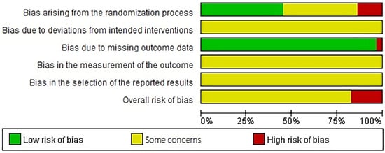 The methodological quality of the 29 included studies is summarized in Figure 3 and Table 5. The risk of bias in studies was assessed using the Risk of Bias 2.0 tool []. The overall risk of bias, in one or more domains, was evaluated to be of “some concern” in 25 studies and “high” in four studies. In all other studies, the overall risk of bias was evaluated as “high”. Regarding reporting detailed information about the randomization process, 13 studies were assessed as “low” risk, 12 studies as “unclear”, and the remaining 4 studies as “high” risk. Allocation concealment assessed 16 studies as “high” risk and 13 studies as “unclear” risk. Blinding and selective response assessments of all the studies were assessed as “unclear” risks owing to the uncertainty of the information. In the incomplete outcome data and other biases, most studies were assessed as “low” risk, except for one study, which had incomplete outcome data.
