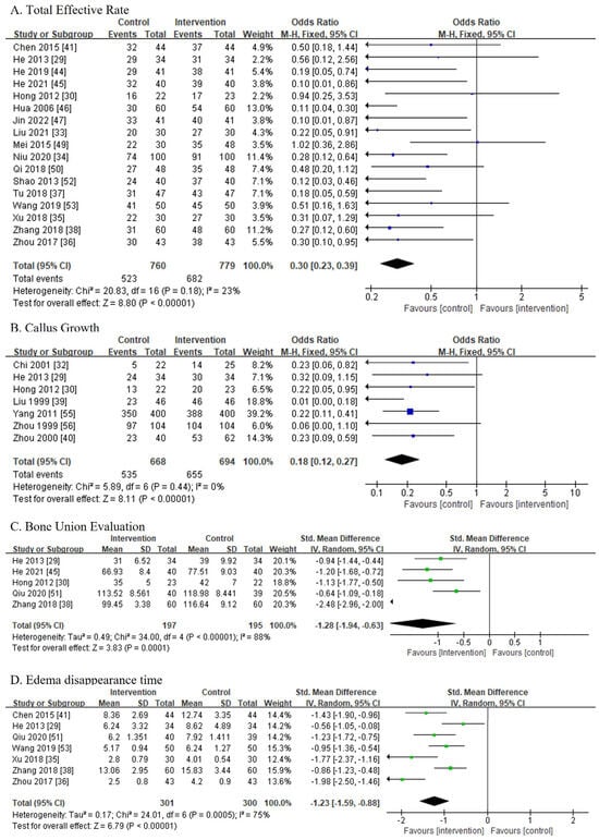 Primary outcome [,,,,,,,,,,,,,,,,,,,,,,]. (A) Total effective rate. (B) Callus growth rate. (C) Bone union evaluation. (D) Edema disappearance time.