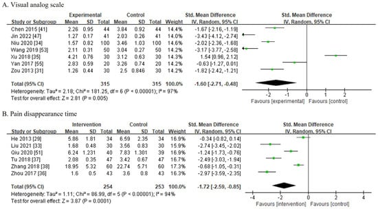 Secondary outcomes (pain reduction) [,,,,,,,,,,,,]. (A) Visual analog scale (VAS) pain scores. (B) Pain disappearance time.