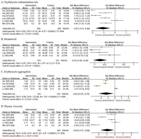 Others (blood test results) [,,,,,]. (A) Erythrocyte sedimentation rate. (B) Hematocrit. (C) Erythrocyte aggregation. (D) Plasma viscosity.