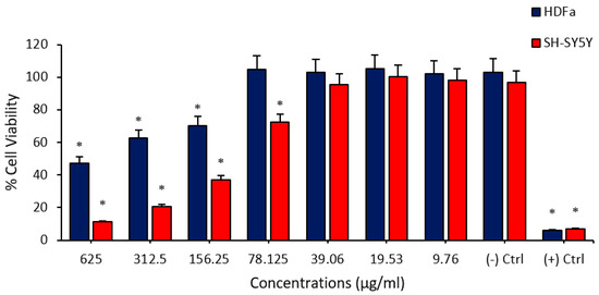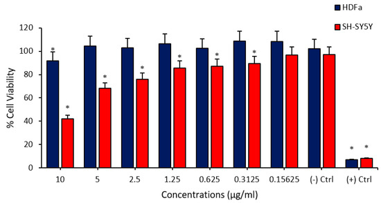 Cell viability analyses were performed on HDFa and SH-SY5Y by using the 3-(4,5-dimethylthiazol-2-yl)-2,5-diphenyltetrazolium bromide (MTT) technique. Briefly, the compounds were applied to cell cultures at defined concentration intervals (1.65 µg/mL to 100 µg/mL) for 24 h. At the end of the incubation period, 10 µL of the MTT solution (5 mg/L) was added to each culture well, and the samples were incubated at 37 °C for 3 h. Then, the culture mediums were discarded, and 100 µL of DMSO was added to the samples to dissolve formazan crystal to obtain a purple/blue color. A microplate reader was used to measure the color intensities at a 570 nm wavelength.