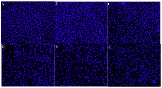 Nuclear structures of HDFa healthy cell cultures treated with FPV and PTX by Hoechst 33258 fluorescent core staining method. (A) Negative control, (B) FPV (9.7 µg/mL), (C) FPV (19.5 µg/mL), (D) FPV (39 µg/mL), (E) PTX (10 µg/mL) and (F) FVP (39 µg/mL) + PTX (10 µg/mL).