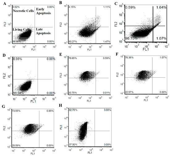 Determination of the synergistic effect of FPV and PTX on SHSY-5Y neuroblastoma cells by flow cytometry analysis. (A) Negative control, (B) only FPV application at 39.06 µg/mL concentration, (C) only FPV application at 19.53 µg/mL concentration, (D) only FPV application at 9.76 µg/mL concentration, (E) 39.06 µg /mL of FPV and 10 µg/mL of PTX application, (F) 19.53 µg/mL of FPV and 10 µg/mL of PTX application, (G) 9.76 µg/mL concentration FPV and 10 µg/mL concentration PTX application and (H) only 10 µg/mL of PTX application.