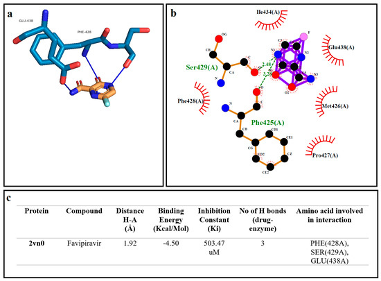 In the molecular docking study, the binding affinity and interaction profile of the CYP2CDH enzyme with Favipiravir were elucidated. PyMol and LigPlot visualizations revealed an optimal binding mode with Favipiravir snugly positioned within the active site of CYP2CDH, characterized by a binding energy of −4.50 Kcal/mol and an inhibition constant of 503.47 µM (Figure 1). The docking formation displayed three hydrogen bonds with the amino acids SER (428A), PHE (429A) and GLU (438A), with the bond distances suggesting favorable interactions, particularly a hydrogen bond with a distance of 1.92 Å. The interaction profile, corroborated by the Protein–Ligand Interaction Profiler, highlighted a network of hydrophobic and hydrogen bond interactions, where the blue lines and dashed-gray lines in the PyMol visualization represented these interactions, respectively. This detailed interaction map contributes to our understanding of the molecular mechanisms by which Favipiravir may exert its inhibitory effects on the CYP2CDH enzyme (Figure 5).